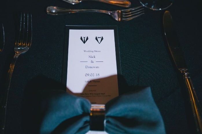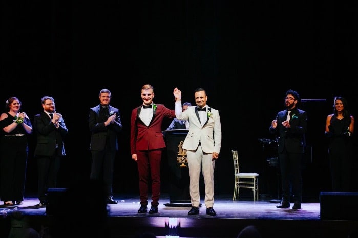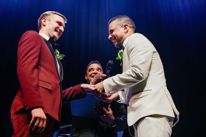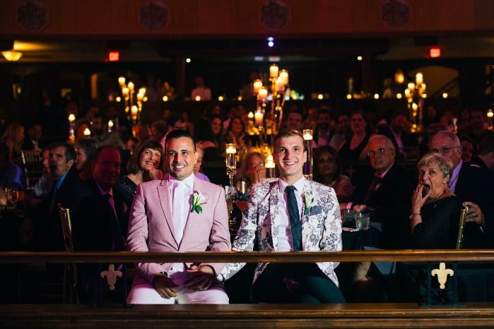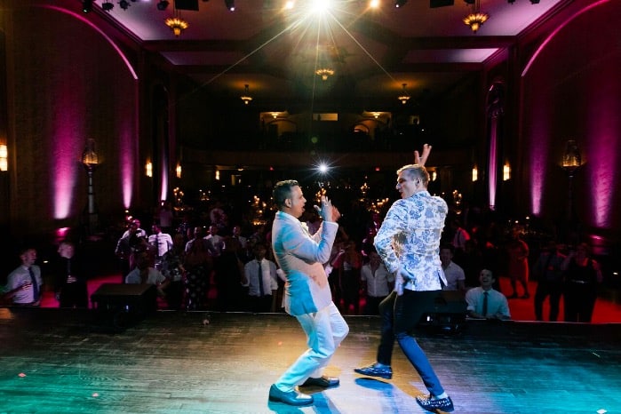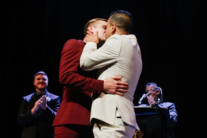 A romantic ceremony on stage watched from below was the start of the night. Sentimental vows were exchanged and there was not a dry eye in the house as the groom’s brothers performed the ballad, “Make You Feel My Love” as the rings were placed. As the ceremony came to a finish, Nick and Donovan shared a sacred kiss, now pronouncing them Husband and Husband!