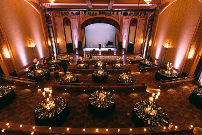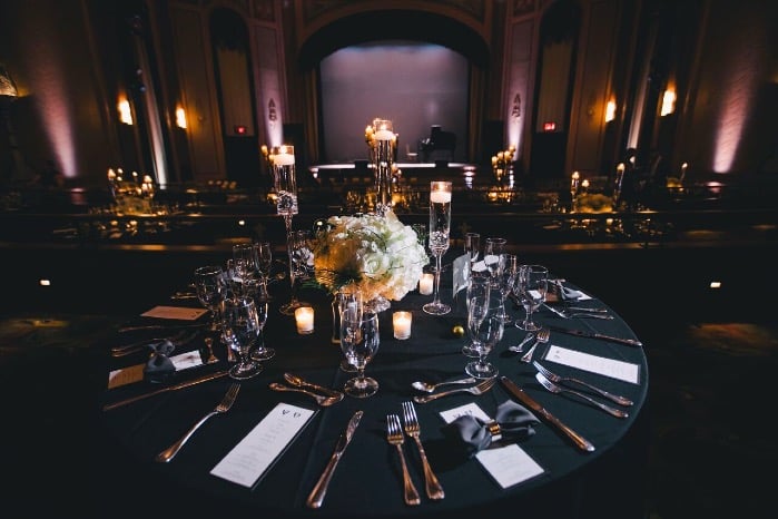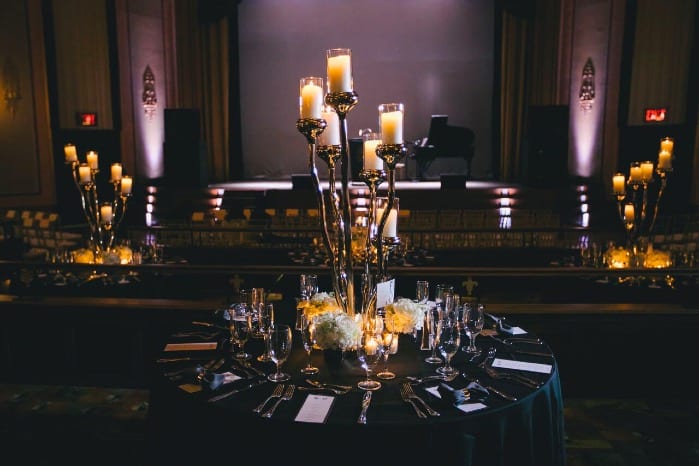 The Suffolk Theater was transformed into a sophisticated atmosphere, full unique centerpieces, candlelight, lush blooms and personalized accents. As the venue already had so much charm and character, the happy couple wanted to play up the theme, and keep art deco décor alive. It was a one of a kind event for the couple, guests and the showplace team as well! The high candelabra centerpieces made a grand statement and added to the overall ambiance, but the soft white blooms and romantic décor elements helped keep this grand theater romantic, intimate and soft.