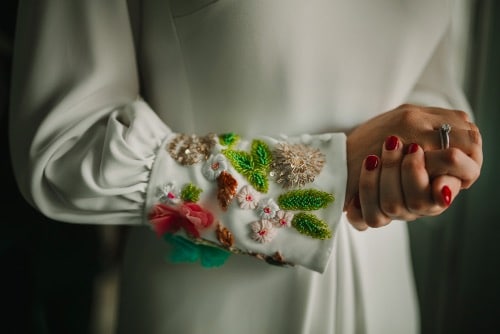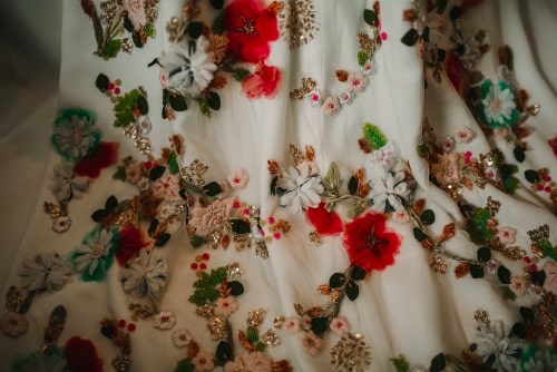 The next category of wedding dresses that we are excited to show you are gowns that incorporate patterns, colors and designs. This is a step up from a colorful dress; these designs are fun, bold and make a statement! Gowns in this category include floral patterns, decorative embellishments or geometric lines, and it’s safe to say these gowns are a work of art!