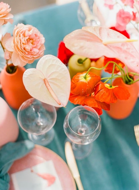 Another great way to incorporate this beautiful color story into your wedding or event decor is by adding pops of coral in other aspect besides florals! Table numbers, cake decor, linens, vases, drinks and more! The list goes on and on, it’s all about using your creativity! This is a perfect way to have a gorgeous vibrant color in a subtle and beautiful way.