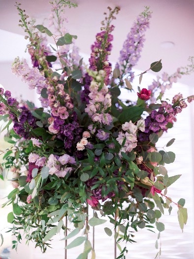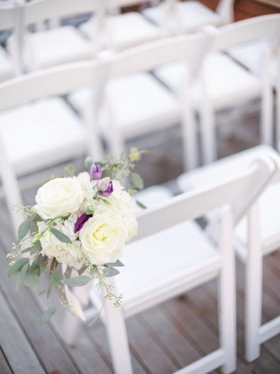 The ceremony space came together with a crisp white aisle runner, chair florals and our favorite part, a stunning floral arch. Composed of an assortment of blooms, this ceremony centerpiece was colorful and tasteful. Pastel pinks, lavenders, white and lots of our favorite greenery brought this space to life!