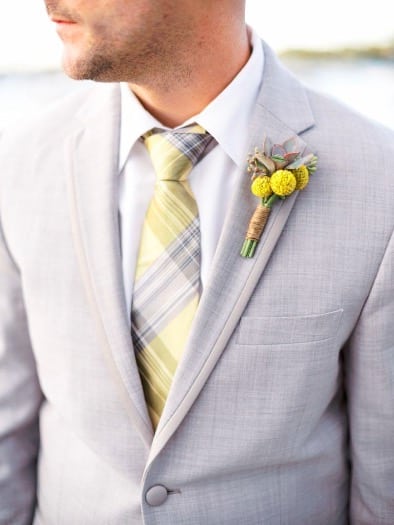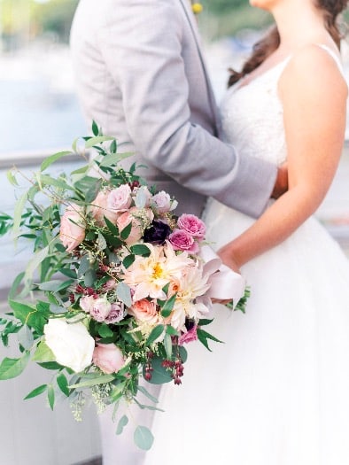 Lindsay’s bouquet was one of our favorites of 2018! Not to say we don’t love every bridal bouquet we design, because believe me we do! But this bouquet felt unique, different and brought lots of character. Using lots of sage greenery, we filled in this heart shaped bouquet with some of our favorite novelty flowers including ranunculus, lisianthus, sweet pea, spray roses, garden roses, wax flowers and the forever show stopping café dahlia. She was a beauty, being held by the most beautiful bride in the room! Brandon wanted a pop of color as well, and his handsome gray suit was complimented with a yellow billyball boutonniere and greens.