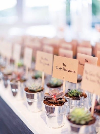 As the ceremony wrapped up, guests were welcomed into the cocktail hour by a stunning escort card display! This was such a fun escort display for us to create because it was different than others we have designed before; it incorporated the guest favors. Each guest would search and find their seat number through a sea of rosette succulents, which sat underneath a colorful larkspur and delphinium high garden style centerpiece.