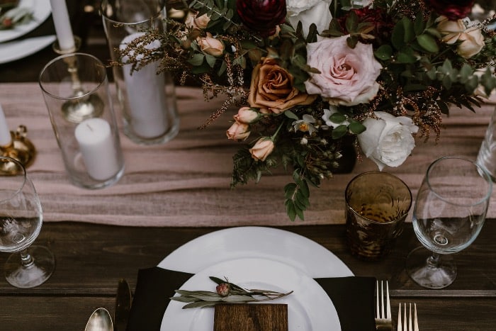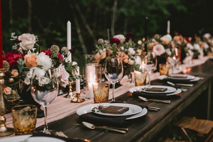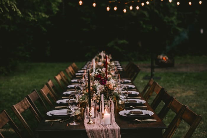 Last but certainly not least, for a quaint fall wedding, we really love an intimate and cozy indoor setting. As much as the fall speaks to us in an outdoor language, it’s also safe to say that being inside with the smell of a fireplace, pumpkin pie and cider is a way to be. Getting married in a romantic library with a deep rich wood and a fire going is thought to be a perfect nighttime fall wedding. Cheering under a gorgeous chandelier covered in greenery and a room filled with candlelight overlooking the river can be the perfect option for some. Make it rustic, rich, warm and snug, and you have the perfect recipe for a less traditional autumn affair.