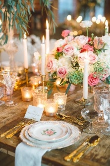 Now that your wedding look book has been confirmed, we can move onto the flowers and décor! With vintage style décor, its important to remember to keep things subtle, less is always more. Using raw tables, unlike chairs, lots of candlelight and beautiful soft flowers can really make the room come to life. We really enjoy featuring little gold accents which may include a grouping of dissimilar candleholders, fancy flatware, vintage patterns linens, hand painted chargers, crystal accents and of course lots of lace and mirrors.