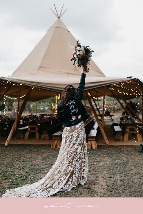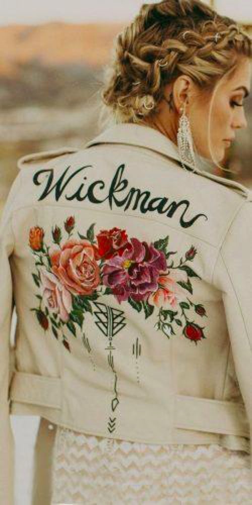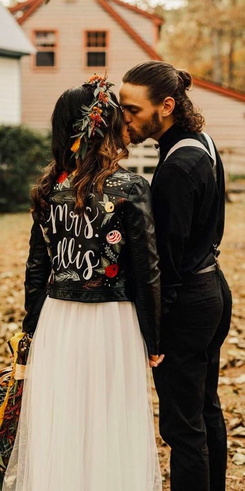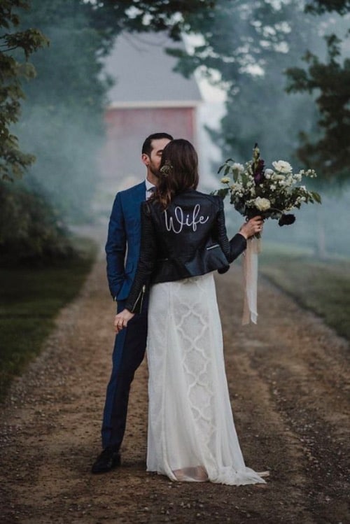 One of the newest trends we love in terms of ‘cover ups’ for our late fall and winter weddings are personalized jackets. When you think of a jacket you wouldn’t usually envision it paired with a wedding dress, but have things changed! Brides of today love to add personalized items to their wedding look and custom made denim and leather jackets are the latest trend! This is a fun idea that can compliment many different wedding styles. While denim jackets are perfect for a rustic farm wedding and usually worn more in the fall, the leather jacket is for our chilly winter season. Leather jackets are more practical for the cold weather and look super cute with handmade designs. We find these jackets mesh really well with a variety of themes like vintage, eclectic, rustic or boho and are always chic and fashion forward! What we love most about these jackets is that they are no longer only for the bride, but you can have a matching one for your loved one. Personalize them with Mr./Mrs., bride/groom, last name, wedding date, favorite quotes and more! These jackets are the perfect trim for out-of-the-box couple and we love how they are dress them up and personalize them to complement their look. They are cozy, warm, fashionable, and the best part is that they can be worn and cherished for years to come.